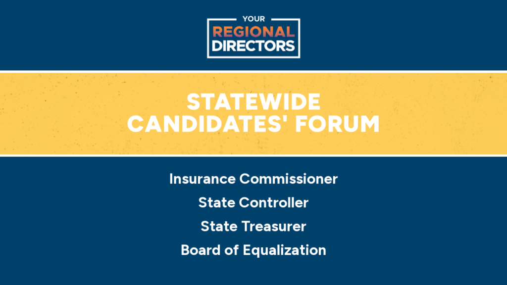 These forums are an independent project organized by a coalition of individuals who hold the title of Regional Director but are acting solely in their individual capacities. Any use of the term “Regional Director” is for identification purposes only and does not imply that the California Democratic Party is involved in, connected to, associated with, or supportive of these events.